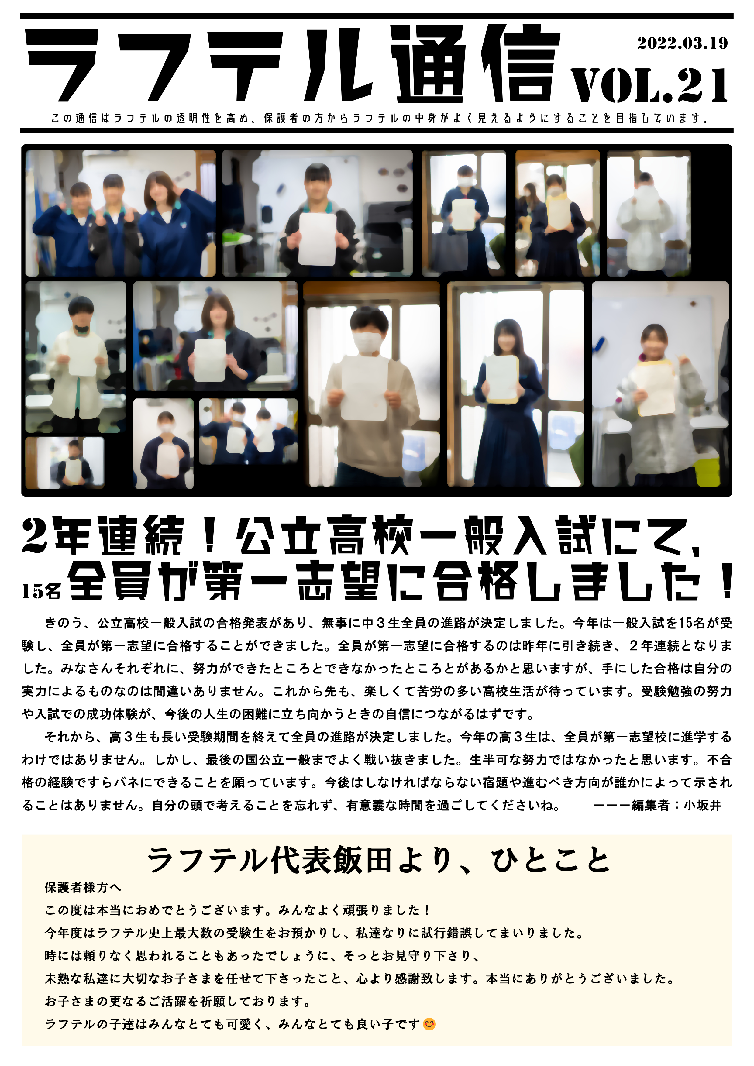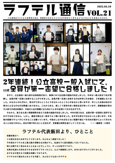 2021年度・2022年度の2年連続で、兵庫県公立高校一般入試を受験した生徒さんが全員第一志望に合格しました。